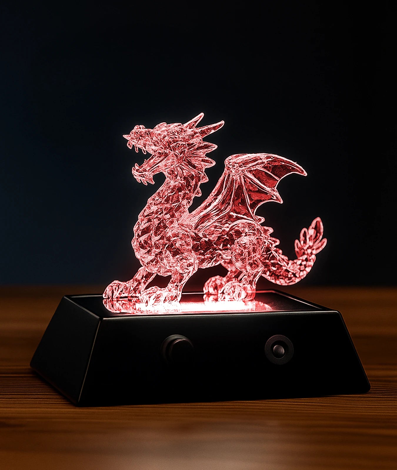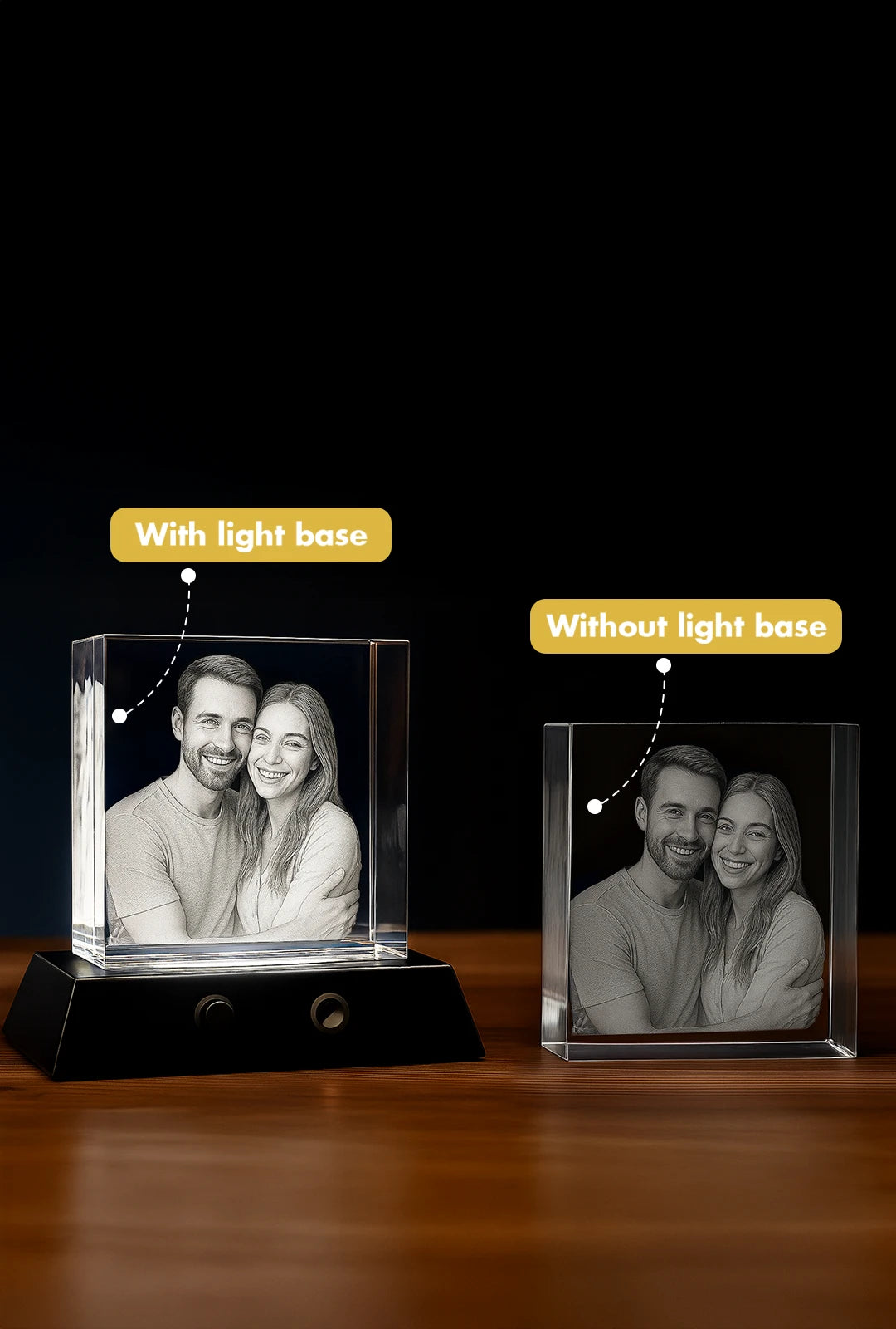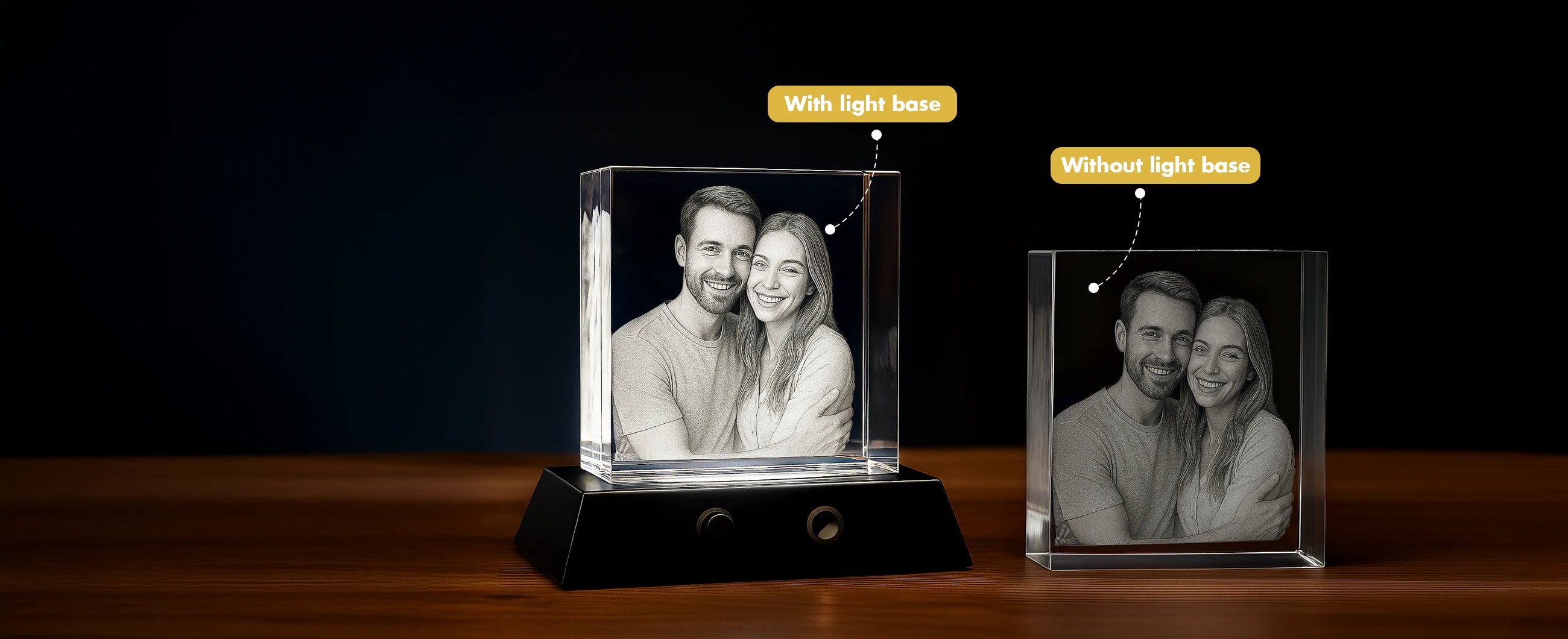 Shiba Inu dog looking at a personalized 3D crystal photo of a couple with their dog inside a glass rectangle on a wooden base